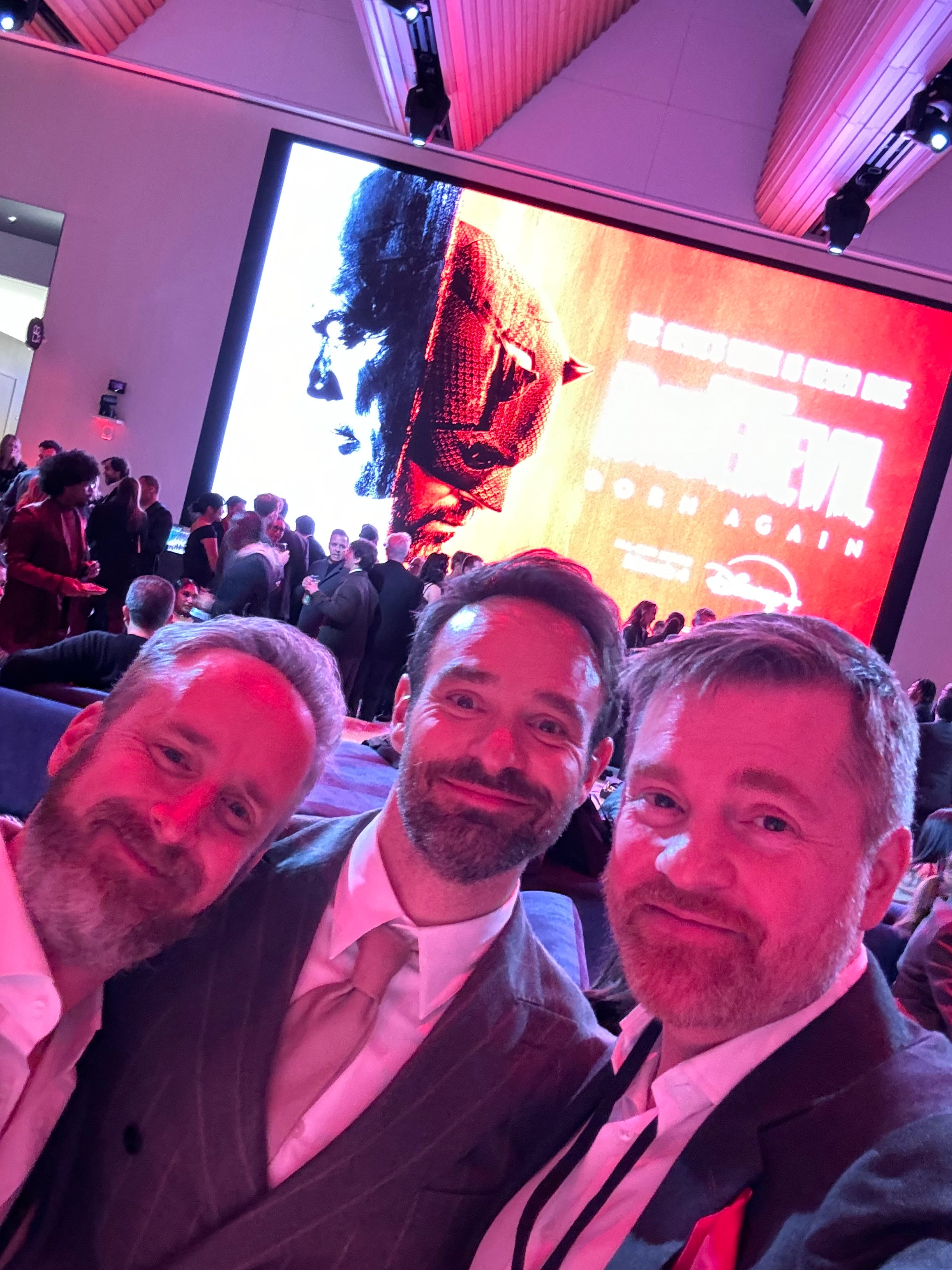 •Attended the DAREDEVIL: BORN AGAIN premiere but when Daredevil started beating people up I walked out, shouting “that’s not how you solve problems!” They still let me into the after-party, where I drank a bunch of cocktails called “Hell’s Kitchen Sink”s and whispered, “this is how I solve problems.” Got a picture with two Charlies.