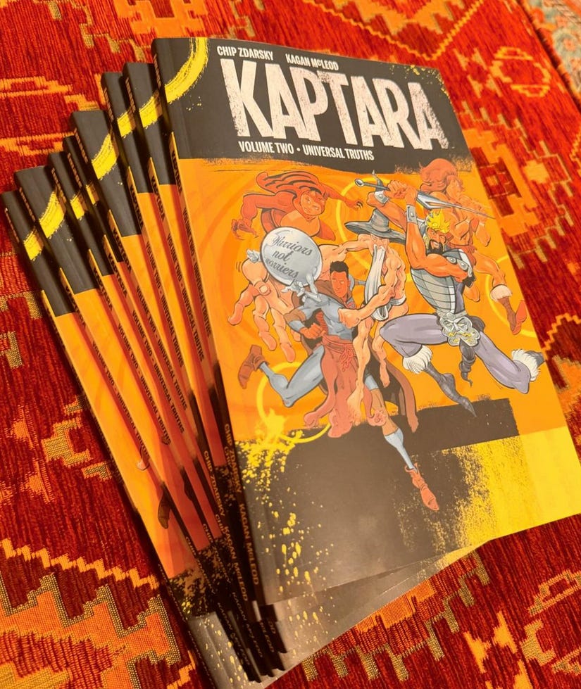 Finally! After years of waiting patiently, you can now use your cold, hard cash to purchase the grand finale of Kaptara in collected form! KAPTARA: UNIVERSAL TRUTHS is in comic shoppes this week! It is glorious and vibrant and chock full of good old fashioned fun!