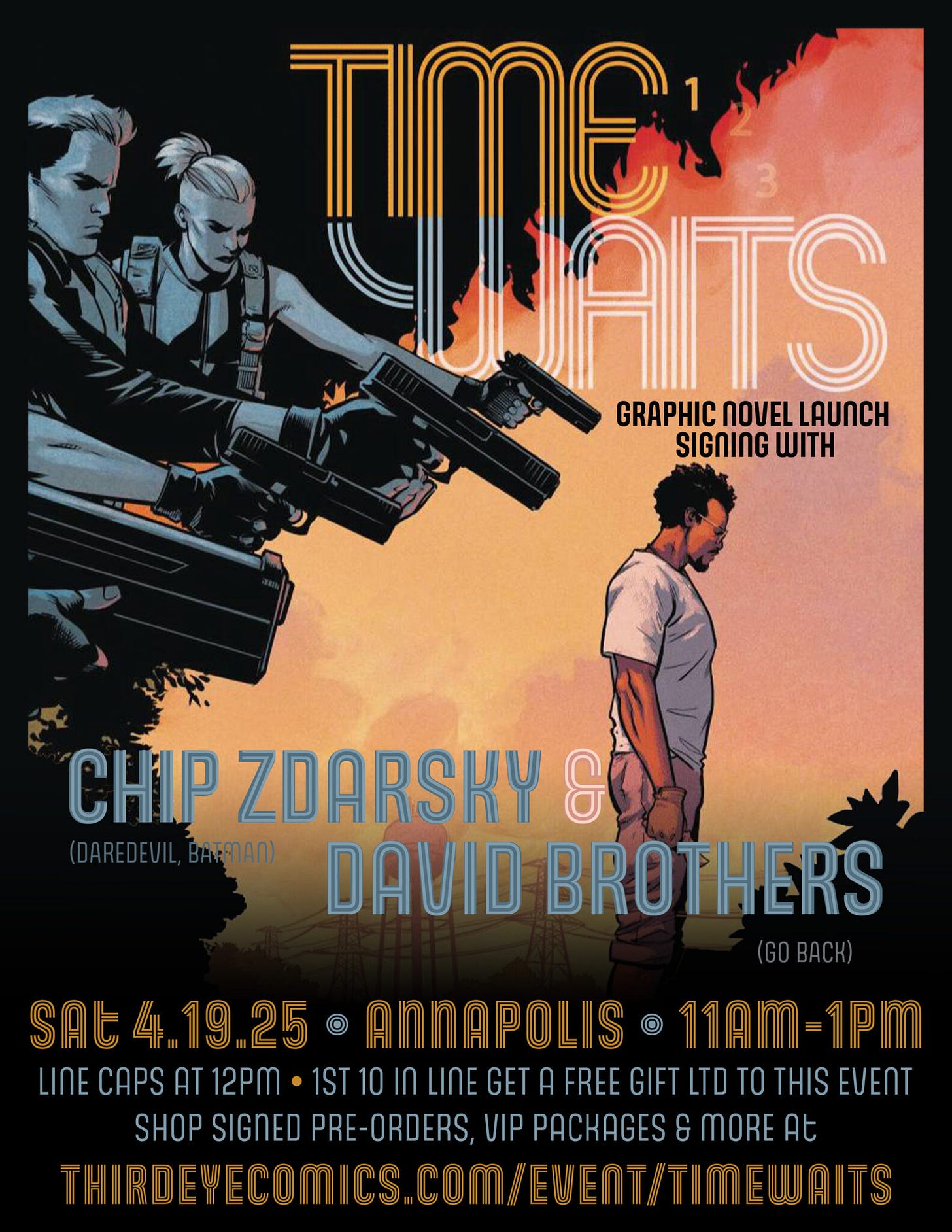One last plug for this event on Saturday! David and I will be signing at THIRD EYE COMICS for TIME WAITS and it’s gonna be great and fun! Come on out if you’re in the area!
