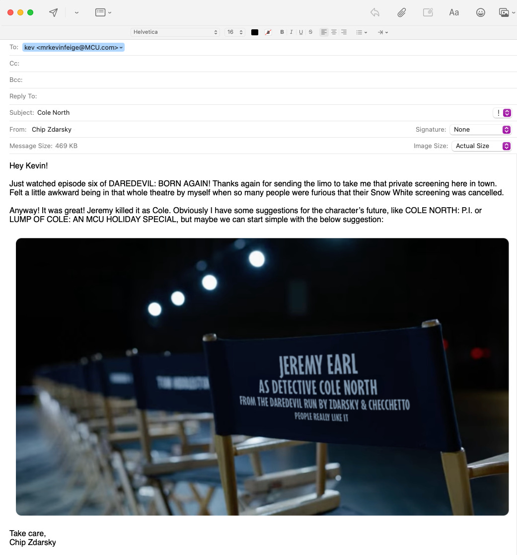 Anyway! I didn’t let being sequestered in the studio stop me from watching my first foray into the MCU as a comics creator!! DAREDEVIL: BORN AGAIN episodes five and six came out this week and I sat down and watched episode five and was fucking furious that my character didn’t show up once. So then I watched episode six and there he was!