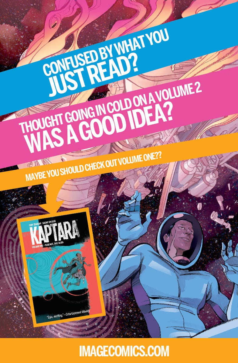 I don’t think Kagan or myself are expecting a lot of new readers coming into our semi-abandoned space opera of 2015, but we really wanted to make something for the fans who were with us back when we started this weird, special story. If you weren’t there for its beginnings, well, hey, here’s the first volume. Have a fun read this weekend!