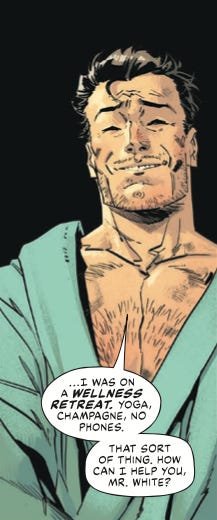 I know, I know, “ugh, look at all this creator-owned work! All I crave is BATMAN!” Well, I don’t have any Batman sneak peeks I can share with you, sadly. But I DO have a panel of spoiled billionaire Bruce Wayne that I can share….